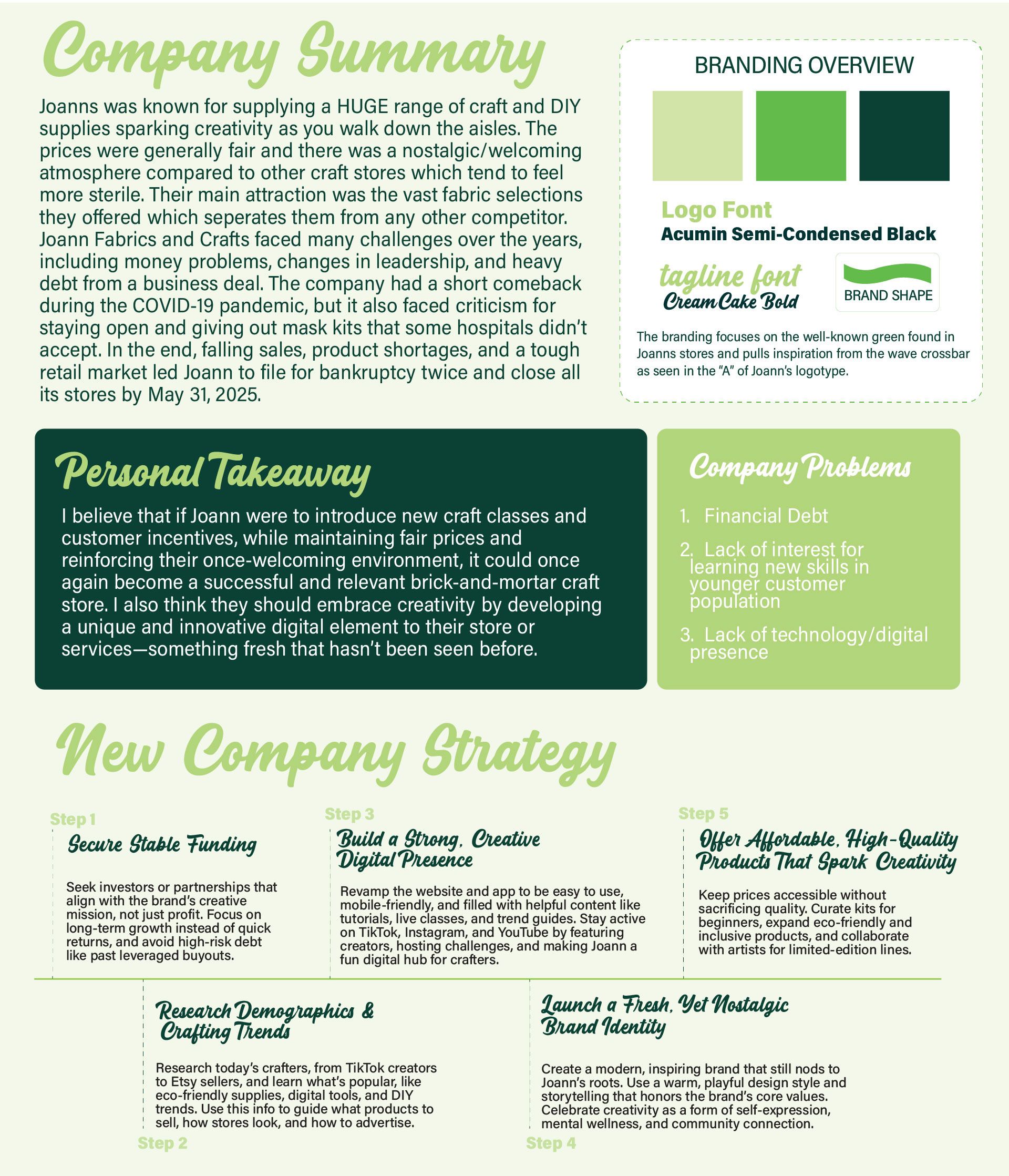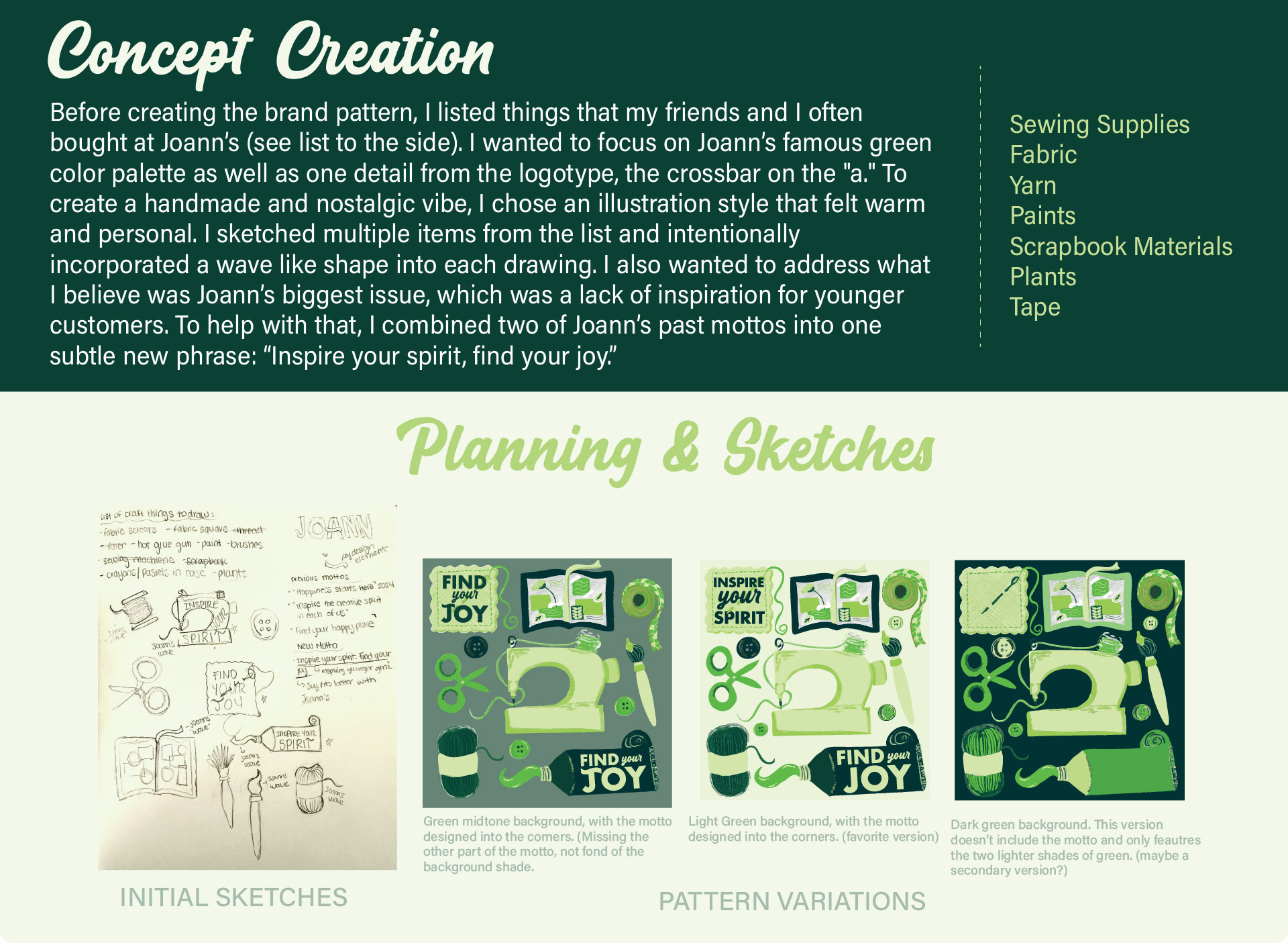 As an avid crafter, when Joann Fabrics closed in 2025 I was heartbroken. It was always my go to store because it was welcoming, inspiring, and a friendly atmosphere. For this project, I reimagined a new branding style and pattern that Joanns could use if they were to reopen. This pattern and branding takes key aspects from previous guidelines (such as their color palette and motto) but reimagines the company as more modern and trendy. I specifically focused on the color palette that was very familiar in the stores as well as the items the store's demographic had the most connection with.